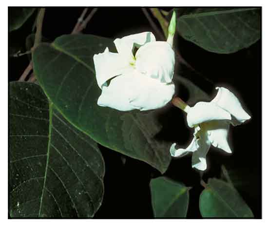 • Dichotomously branched, laticiferous trees or shrubs, 2-6 m tall. Bark grayish or yellowish, smooth or pustular. Leaves opposite, often in unequal pairs, sessile or subsessile, amplexicaule; lamina broadly elliptic to oblanceolate, 24-47 x8-16 cm, acute or acuminate at apex, rounded or auriculate at base, entire, green above, pale below; secondary veins 15-25 pairs, raised below, glabrous except on nerves below. Inflorescence long-peduncled, erect or drooping, first branching dichotomous, further branching cymose, laxly flowered, glabrous. Peduncle stout, 9-20 cm long. Flowers 5-merous, pedicelled. Pedicels to 2.5 cm long. Bracteoles deciduous, ovate, to 8 mm long. Calyx somewhat companulate, divided to middle, glabrous, with many basal glands within and shedding with the corolla; lobes 5, suborbicular, almost as long as tube. Corolla large, rotate or salver-shaped, to 7 cm across; tube to 1.7 cm long, longer than calyx, twisted; lobes 5, overlapping to the left in bud, 2 cm across, obovate-truncate or rounded, spreading. Stamens 5, inserted at the mouth of the corolla tube; filaments short; anthers sagittate, to 5 mm long, cohering with the stigma. Disc 5-lobed, yellow. Ovary 2-carpellary, apocarpous, many-ovuled; style to 1.6 cm long; stigma acute with a ring at base. Fruits of two, recurved or divaricate mericarps, somewhat elongate-reniform or obovoid-oblong, yellow or green with many pale gray or brownish warts, glabrous, 7-8 cm long. Seeds many, ovoid, dark brown, to 8 mm long; testa rugose; aril orange red. (3)