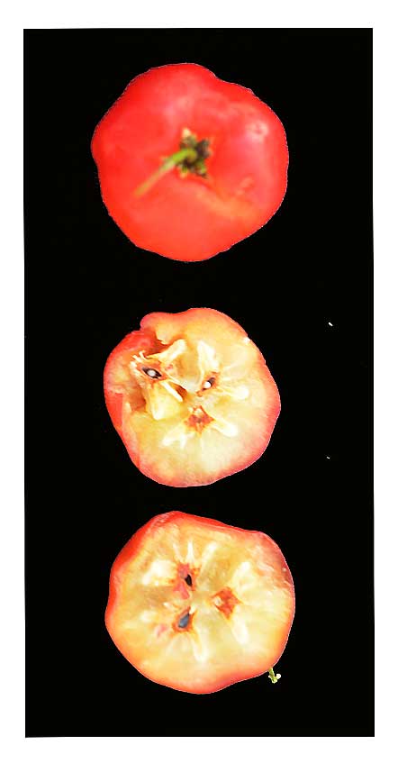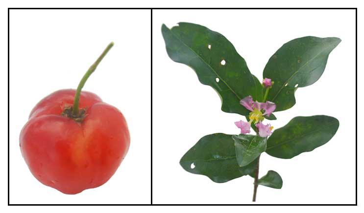 • Acerola is an evergreen shrub or small tree with spreading branches on a short trunk, usually 2–3 m (6.6–9.8 ft) tall, but sometimes reaches 6 m (20 ft) in height. Bark of young branches is green and sparsely covered with curly-haired trichomes, which fall off with age. Grayish to brownish bark is relatively smooth and covered with conspicuous cork when young, becoming thick and cracked with age. Leaves are simple, ovate to elliptic-lanceolate, 2–8 cm (0.79–3.15 in) long, 1–4 cm (0.39–1.57 in) wide, with an entire or undulating margin, attached oppositely on the stem on short petioles. Leaves have small hairs, which can irritate skin. Flowers are bisexual, 1–2 cm (0.39–0.79 in) in diameter, with five pale to deep pink or red fringed petals, 10 stamens, and six to 10 glands on the calyx. Three to five flowers per inflorescence are sessile or short-peduncled axillary cymes. Three years after planting, trees start producing fruits. 3–4 weeks after flowering, a number of bright red drupes 1–3 cm (0.39–1.18 in) in diameter with a mass of 3–5 g (0.11–0.18 oz) mature. The shell of the fruit is smooth and very thin. Its shelf life of 2–3 days at ambient temperature makes it highly perishable. Drupes are in pairs or groups of three, and each contains three triangular seeds. Drupes are divided into three obscure lobes. (21)