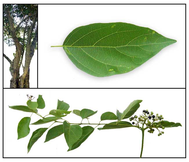 • Trees, to 7 m high. Leaves simple, opposite, estipulate; petiole 4–14 mm, slender, pubescent, grooved above; lamina 2.5-8.5 x 2–7.2 cm, elliptic, elliptic-oblong, base acute, obtuse, subcordate or rounded, apex acuminate, mucronate, obtuse, margin entire or subserrate, glabrous above except along the appressed midrib, chartaceous; lateral nerves 3-5 pair, pinnate, prominent, puberulous beneath; intercostae reticulate, obscure. Flowers bisexual, greenish-white, in terminal corymbose panicled cymes; bracts small; calyx small campanulate, 2 lipped, 5 lobed; corolla tube short, villous inside, lobes 5; stamens 4, didynamous, inserted below the throat of the corolla tube; anther ovate; ovary superior, 2-4-celled, ovules 4; style linear; stigma shortly bifid. Fruit a drupe, seated on the calyx, globose, purple; seeds oblong.