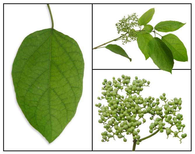 (cymes) 8 to 20 centimeters in diameter. Fruit is fleshy, dark purple, rounded,