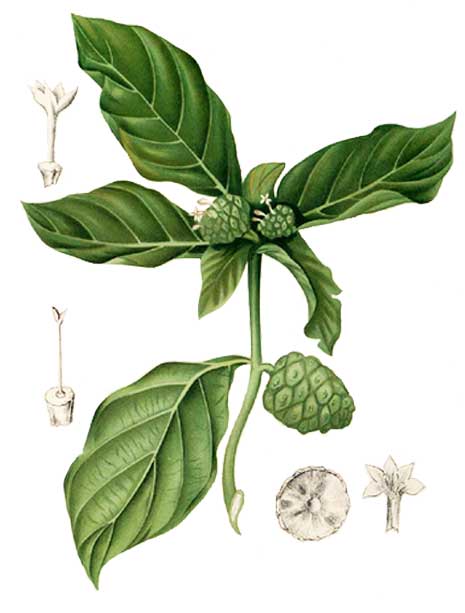 • Antiviral / Anti-Hepatitis C / Leaves: Study of a methanol extract of M. citrifolia, its n-hexane and ethyl acetate fractions using a HCV cell culture system demonstrated anti-HCV activities with 50%-inhibitory concentrations (IC50) of 20.6, 6.1, and 6.6 µg/mL, respectively. Bioactivity guided purification and analysis isolated and identified pheophorbide a, the major catabolite of chlorophyll a, as the anti-HCV compound in the extracts. It was found to possess anti-HCV activity (IC50=0.2 µg/,L). Results suggest pheophorbide a and its related compounds have potential as candidates for seed compounds for development of antivirals against HCV. (79)