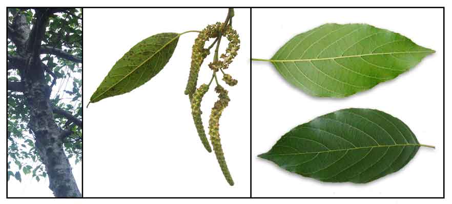 Alnus japonica is a deciduous to semi-evergreen tree to 20 m tall. Bark dull grey-brown, smooth to somewhat corky. Branches dark grey or grey-brown, striate, glabrous. Branchlets brown, glabrous or yellow pubescent when young, sometimes prominently resinous glandular. Buds 6–9 × 2–3 mm, stipitate, with 2 glabrous scales, terminal buds with leaves exposed over winter, applanate vernation. Petiole 1–3 cm, thin, sparsely resinous glandular and shortly pubescent. Leaves leathery, obovate or elliptic-obovate on short shoots, obovate-lanceolate on long hoots, 4–14 × 2.2–5 cm, apex mucronate, acute, or, base cuneate (rarely oblique), margin remotely minutely mucronate-serrate, occasional 1–2 teeth between primaries, lateral veins 7–11 on each side of midvein, craspidodromous, sparsely pubescent at first, glabrescent, sometimes resinous glandular and bearded in axils of lateral veins, adaxially glabrous. Staminate inflorescences terminal, 2–5 in sub-erect raceme, purple-brown, narrowly oblong, 20–30 × 5–6 mm in bud, to 80 mm at anthesis. Pistillate inflorescences below males 1–2, ellipsoid, 5–8 × 4 mm. Fruit ovoid, 2–35 × 10–20 mm, bases cordate to cuneate, apex obtuse, peduncle robust 3–8 mm, scales woody, hard and rigid with five even lobes, very resinous. Seed obovate (rarely ovate-elliptic), 2–3 mm, with minute wings, styles divergent. (Iwatsuki, Boufford & Ohba 2006Li & Skvortsov 1999).