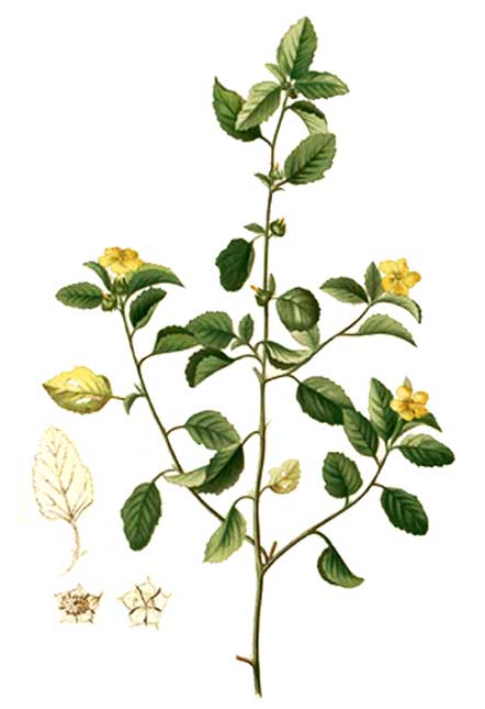 Babara is an erect, somewhat hairy, branched, half-woody perennial, about 1 meter high. Leaves are oblong to ovate-lanceolate, 2 to 5 centimeters long, with blunt tip, rounded base and irregularly toothed margins. Flowers are axillary and terminal. Calyx is green, about 7 millimeters long, with lanceolate and pointed lobes. Petals are yellow, about 8 millimeters long. Fruit has 8 to 12 reniform, compressed, hirsute carpels, 2 to 3 millimeters long, each carpel having 3 short, straight projections.