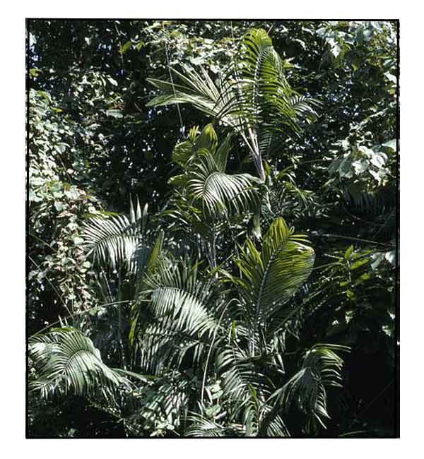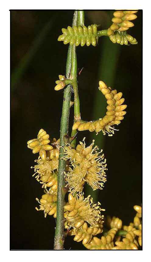 • Calamus usitatus is a spiny evergreen, climbing palm producing a slender to moderate clustering, thicket-forming rattan with stems to rarely more. Stem without sheaths to 5-10 mm, with sheaths 10-23 mm; intei to 15 cm; sheaths bright green, very sparsely to densely armed with scattered golden brown to 45 mm, and caducous pale grey indumentum; sometimes main body of she unarmed, but even when so, spines present around leaf sheath mouth; spines aroui sheath mouth ± erect, much larger than the rest, borne close together in a neat row, 11 to 12 cm. Knee conspicuous. Ocrea to 5 mm, very densely armed with minute spiculezm or spines to 3 mm. Flagellum to 1.5 m. Leaf ecirrate to 90 cm, frequently less, including petiole to 20 cm; petiole armed with few horizontal golden brown spines; leaflets about 30 on each side of the rachis, close, regular, (in Sabah; most Philippine populations have grouped leaflets), the largest to 30 x 1.4 cm armed with black bristles along margins, 3 main veins on upper surface, and midrib beneath. Male and female inflorescences superficially similar, to 2 m? with 5 or more partial inflorescences; bracts on main axis close tubular, variously armed with golden brown spines but always with apical tufts of erect slender spines to 20 mm; partial inflorescences to 40 cm, with curving axes and curved rachillae; male rachilla to 40 x 2 mm; female rachilla to 50 x 3 mm. Mature fruit ovoid, about 8 x 6 mm, with a short beak to 1 mm, and covered in 18 vertical rows of straw-coloured scales. Seed c 6 x 4 mm. Endosperm apparently homogeneous. (2)
