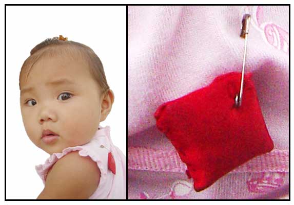 Above, a young child pinned with an "unton." This particular one purchased from an Aita vendor, believed to be more potent in preventing "bales." It is left pinned on, night and day, until the child is three or four years of age, at which time she is believed to be less prone or more resistant to bales or usog.