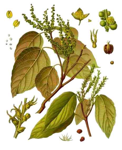 • A shrub or small evergreen tree 3-6 m high in Pakistan, elsewhere up to 20 m. Stems fluted in age. Bark rough, dark grey, thin. Wood white. Young shoots, petioles, leaves and inflorescences fulvous- to ferruginous-pubescent. Leaves alternate or subopposite. Petioles 1-4 (-7) cm long. Leaf-blades ovate to ovate-lanceolate, 5-15 x 2-9 cm, acute or subacutely shortly acuminate, subentire, cuneate, rounded or subtruncate at the base, triplinerved from the base, lateral nerves 3-8 pairs, tertiary nerves ± parallel, glabrous above, with a pair of large glands at the base, sparingly pubescent and minutely reddish-gland-dotted beneath, glaucous. Stipules minute, fugacious. Male inflorescences terminal, spicate or racemose, often clustered and appearing as if paniculate, up to 7 cm long, dense-flowered; bracts triangular, 1 mm long, persistent. Male flowers subsessile, or with pedicels 1 mm long; calyx-lobes ovate-lanceolate to lanceolate, 3 x 1-1.5 mm, acute, pubescent, glandular; stamens c. 30, 3 mm long, anthers 1 mm long, with a few apical glands; disc minute, central. Female inflorescences ± as in the ♂, but shorter and less crowded. Female flowers sessile or subsessile; calyx-lobes 3-5, triangular-ovate, 1.5 mm long, closely adpressed to the ovary, subpersistent, otherwise as in the ♂; ovary subglobose, c. 1 mm diam., pubescent and densely red-glandular; styles 2-3 mm long, plumose, green. Fruit trilobite-subglobose, occasionally quadrilobate, 8-10 x 6-7 mm, ± smooth, densely covered with crimson granular glands, which rub off, loculicidally dehiscent. Seeds subglobose, c. 4 mm diam., ± smooth, black.(Flora of Pakistan)