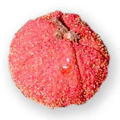 is somewhat spherical, 6 to 8 millimeters in diameter, unarmed but densely covered with red or crimson