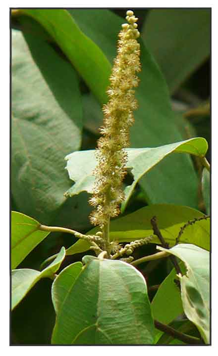 spikes, 5 to 8 centimeters long. Female flowers are in solitary racemes, 3 to 7 centimeters long, and three-cornered. Fruit