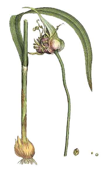 • Foliage: Broadly linear-lanceolate, scattered along the pesudostem; leaf-blade linear oblong, apex acute. Stems: Real stem very short, flattened, forming a disk at the base of the bulb. Bulb depressed globular to ovoid, usually consisting of several bulbels (tiny secondary bulb) covered with protective bulb-coat leaves, whitish to purplish. Pseudostem formed by the sheathing base of successive leaves. Flowers: Inflorescence a sub-spherical umbel with many bulblets and few flowers, protected by a membranous spathe. (81)