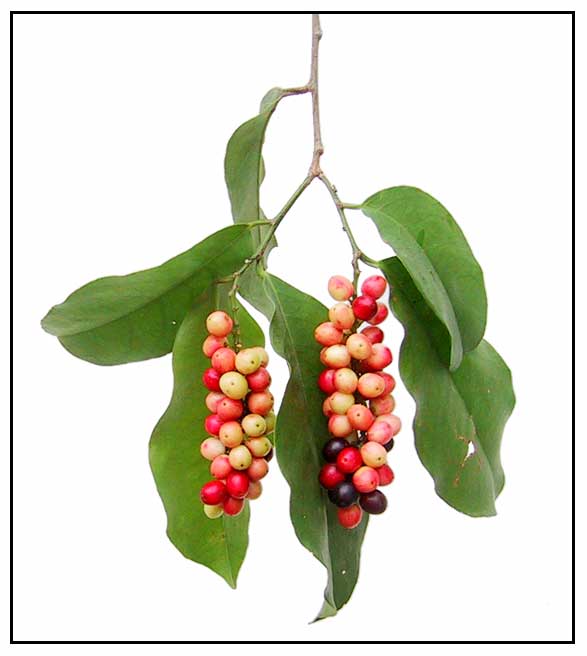 tree, 4 to 10 meters high. Leaves are shiny, oblong, 8 to 20 centimeters long, pointed at the tip, rounded or pointed at the base. Spikes are axillary or terminal, simple, and usually 5 to 15 centimeters long. Flowers are small and green. Male flowers are about 1.5 millimeters in diameter, borne on spikes, while the female flowers grow out on racemes. Fruit is fleshy, red, acid, edible, ovoid, and about 8 millimeters long, single-seeded, and borne in grapelike pendant clusters (often paired), wrinkled when dry, the seed becoming somewhat compressed.
