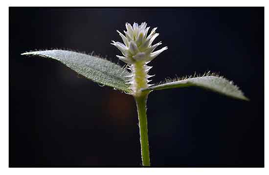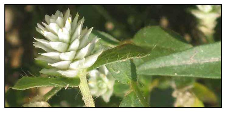 • Botonsilyong-gapang is a prostrate or sprawling annual plant about 20 to 60 centimeters long, with fleshy taproots. Stems are striate and hairy, the older ones smooth. Leaves are simple, and opposite, 2 to 4 centimeters long and tapering on both ends. Flower stalk bears white globose, ovoid, or cylindrical heads, densely covered with persistent white bracts giving the entire cluster an elongated look.