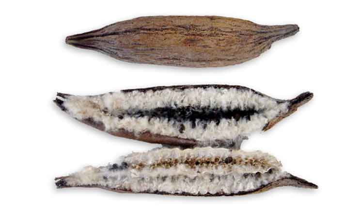 numerous black seeds, which are compressed-globose, smooth, and embedded in fine, silky hairs.