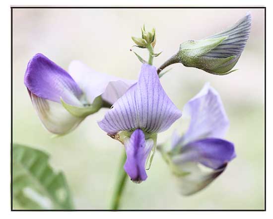 • Annual, subwoody herb, 0.5-1 m tall, with many quadrangular, velvety hairy, yellow branches. Leaves simple, ovate to elliptical, 5-14 cm × 4-9 cm, pubescent; petiole 4-8 mm long; stipules sickle-shaped, 5-20 mm × 4-14 mm, auricled, persistent. Inflorescence a lax raceme, 5-25 cm long, leaf-opposed, with up to 24 flowers; pedicel filiform, up to 5 mm long; bracts linear-acuminate, 4 mm long. Calyx campanulate, 7-11 mm long, hairy, with subequal triangular-acuminate lobes; corolla blue; standard elliptical to suborbicular, 14 mm in diameter; wings ovate-oblong, 13 mm × 6 mm; keel 12 mm × 6 mm, incurved in the middle. Pod oblongoid, 3-5 cm × 0.8-1.2 cm, short stalked, about 16-seeded. Seed heart-shaped, 3 mm in diameter, blackish. (3)