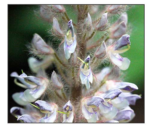 • Growth form: A woody shrub with erect stems and long bushy inflorescence. Foliage: Leaves are pinnately compound with about 2 - 3 pairs of lateral leaflets and 1 slightly larger terminal leaflet. Leaflets are oblong to narrowly ovate (6 - 15 cm long, 3 - 8 cm wide). The petioles are often long (5.5 - 15 cm). Stems: Stem covered in soft, short, gray hairs. Flowers: Flowers have one large ovate petal that hangs over 3 smaller petals. (0.6 - 0.9 cm wide). Flowers are arranged on an inflorescence known as a raceme (an inflorescence with stalked flowers carried along 1 main axis). The inflorescence is light purple and shaped like a cone (15 - 30 cm long). This species flowers from April to September. Fruit: Fruit is an elliptic pod lightly covered in soft, short hairs. (Flora & Fauna Web)