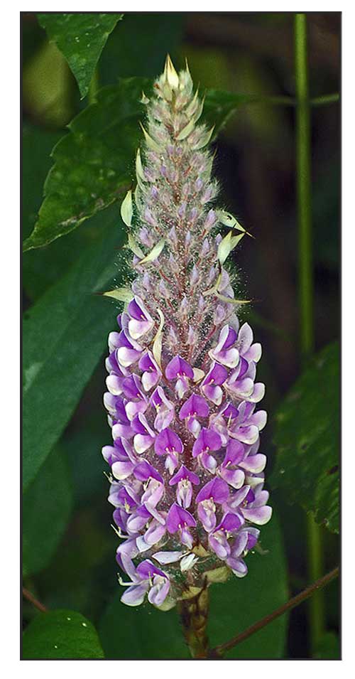 • Erect subshrub, 0.5-2 m tall. Branches terete, densely pubescent. Leaves pinnately compound, upper leaves 3-7-foliolate, lower ones 3-foliolate; petiole 10-13 cm long, pubescent; stipules free, about 1 cm long; stipels 3 mm long; leaflets ovate to lanceolate, 8-16 cm × 1.5-5.5 cm, apex acute, glabrous above, hairy beneath. Inflorescence a terminal, cylindrical, densely flowered raceme, (7-)12-30(-50) cm long; lower bracts empty, upper ones with 2 flowers, lanceolate, 10-20 mm × 3-6 mm; pedicel 3-15 mm long; with long bristles.Calyx tube short, 2 upper teeth up to 6 mm long, 3 lower teeth up to 7 mm long; corolla purplish pink; standard obovate, 6-10 mm × 6-8 mm, glabrous; wings shorter than keel, clawed; keel 7-9 mm long, clawed; stamens 10, diadelphous.Pod 2-4(-7)-jointed, constricted between joints, indehiscent, shiny black, hairy. Seed reniform-globose, compressed, 1.5-2 mm in diameter, brown. (PROSEA)