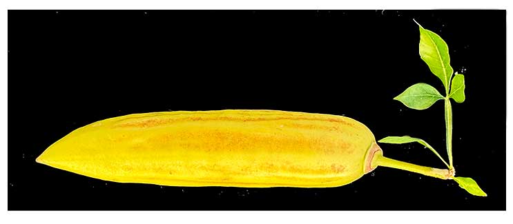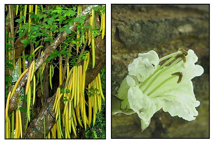 • Tree grows up to 6 m tall. The leaves are arranged oppositely, each made up of three leaflets. They are borne on winged petioles up to 5 cm long. Flower is solitary or borne in a cluster of up to four. The five-lobed corolla is greenish white. Fruit is a taper-shaped berry up to 60 cm long, fleshy and edible, green, ripening yellow, and waxy in texture. Record length is 120 cm long while only 2.5 cm wide. (2)