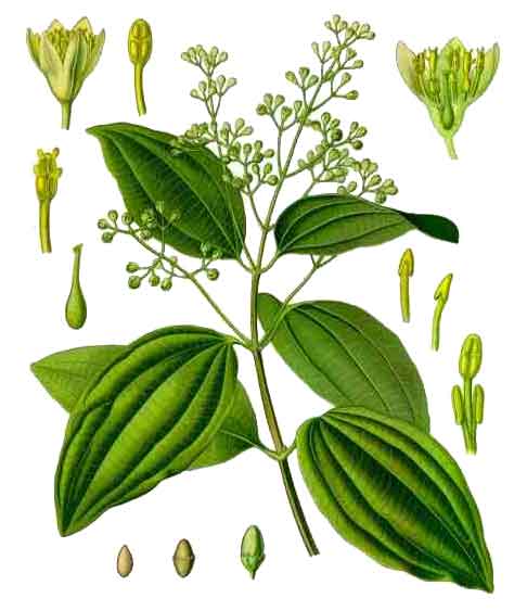 Canela is a medium-sized tree, reaching a height of 12 to 20 meters. Young parts of the plant are smooth, except for the buds, which have fine, silky hairs. Leaves are leathery, shining, oval or oval-lanceolate, 8 to 15 centimeters long, pointed at both ends. Blade is strongly 3- or 5-nerved. Panicles are usually about as long as the leaves, mostly clustered in the upper axils. Flowers are numerous, pale yellow, small, and covered outside with grayish hairs. Fruit is oblong-ovoid, about 1 centimeter long, dry or slightly fleshy, and surrounded by the enlarged, persistent perianth.