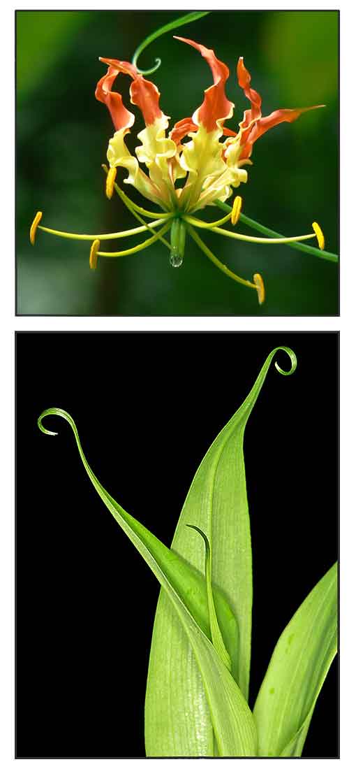 • Climbing lily is a striking tuberous climbing plant. Rootstock is a chain of fleshy arched tubers, budding from the convexity above, cylindrical, flattened, often 15 to 20 centimeters long. Stem grows to 3 meters or more. Leaves are 15 to 20 centimeters long, variable in width, 3 to 5 centimeters across. Flowers are solitary or subcorymbose, towards the ends of the branches, 8 to 10 centimeters across. Petals are linear-lanceolate, spirally twisted, greenish when young, yellowish-orange as they mature, and reddish when fully mature. Filaments are stout and golden yellow, the connective being green. Capsules are about 5 centimeters long.