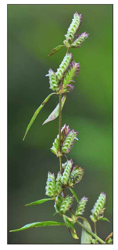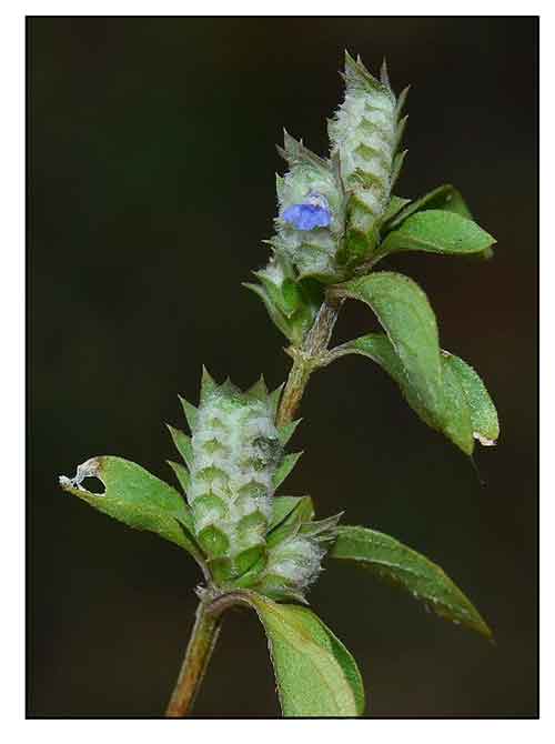 • Herbs 20-50 cm tall, annual or perennial. Stem basally prostrate and rooting at nodes then erect, minutely pubescent. Petiole 0-7 mm; leaf blade oblong-elliptic, 1-4 × 0.4-1.4 cm, glabrous except for a few trichomes along veins, secondary veins ca. 4 on each side of midvein, base cuneate and decurrent onto petiole, margin entire, apex acute. Spikes axillary or terminal, 0.5-2 cm, 1-sided, solitary or sometimes 2 or 3 compound; bracts dimorphic; sterile bracts green, elliptic, ca. 4 × 0.7 mm, glabrous, apex acute; fertile bracts circular to obovate, 4-5 × ca. 2 mm, pubescent, margin broadly hyaline, apex obtuse to rounded to emarginate and mucronulate; bracteoles elliptic, 2-3 mm, margin ciliate, apex 2-cleft and subacute. Calyx colorless, pubescent; lobes linear-lanceolate, ca. 3 × 0.5 mm, margin narrowly hyaline, apex mucronulate. Corolla blue or white, ca. 5 mm, outside pubescent; lower lip 3-lobed, lobes triangular; upper lip ovate, 1-2 mm, apex emarginate. Staminal filaments glabrous. Ovary glabrous. Capsule ellipsoid, ca. 2.5 mm, glabrous, 2-4-seeded, apex apiculate. Seeds orbicular in outline, ca. 1 mm in diam., minutely verrucose. (Flora of China)