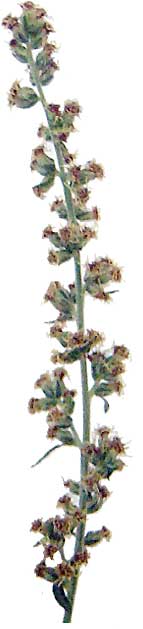 Growth form: Perennial up to 1.5 m tall which becomes woody at maturity. Foliage: Deeply lobed, simple leaves (5-10 cm long, 2.5-7.6 cm wide) resemble a pinnately compound leaf with oblong, irregularly lobed 'leaflets'. The upper leaf surface is green and hairless to sparsely hairy, while the lower surface is white to grey and softly hairy. Upper leaves tend to be more deeply lobed than lower ones. Leaves have a distinct aroma. Stems: Stems are usually reddish brown. Flowers: Compound flowers known as heads are composed of tiny, reddish brown florets. The heads are arranged in a narrow panicle that looks like a spike inflorescence. Fruit: Dry, indehiscent, 1-seeded fruits are known as achenes. (Flora & Fauna Web)