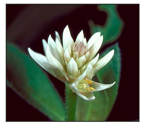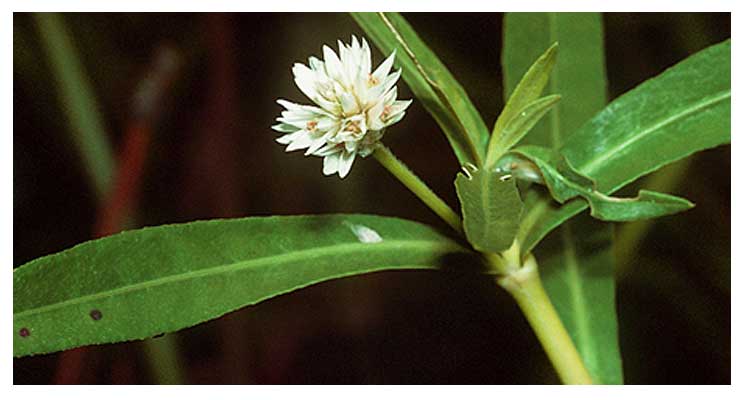 • Perennial herbs with prostrate, fistular, striate, stem rooting at the nodes and eventually become erect and aerial, often much branched forming dense masses. Leaves opposite, 5-10 x 0.5-2.5 cm, elliptic to obovate-lanceolate with acute base, with midrib prominent on the lower surface; petiole 1-6 mm long. Inflorescence axillary (occasionally terminal), pedunculate (1-5 mm long) white, globose heads, 10-18 mm across; bracts ovate-lanceolate, glabrous, acute, 1-veined, faintly keeled. Perianth dorsally compressed, white glabrous; tepals 5, subequal oblong-lanceolate with mucronate tip 1-5 nerved. Fertile stamens 5, pseudo-staminodes longer than the filaments and lacerate at tips. Pollen 10-12 ?m, spherical with 7 large pores, surrounded by pentagonal ridges. Ovary shortly stalked, ovoid with slender style and capitate, densely papillose stigma. (India Biodiversity Portal)