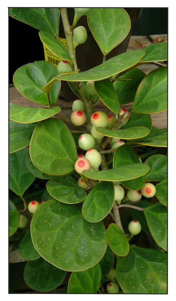 Ficus deltoidea is an evergreen shrub or small tree growing up to 2 m tall. Leaves are alternate along the stem, thick, deltoid in shape, rounded at the apex and tapering at the base; upper surface dark, shining green, the lower surface golden yellow with black spots. Male and female plants are distinctive, the leaves of female plants big and round while the leaves of male plants are small, round and long. Synconia (figs) are round to oblong, 4-15 mm wide, ripen from yellow to orange or red to dark purple.