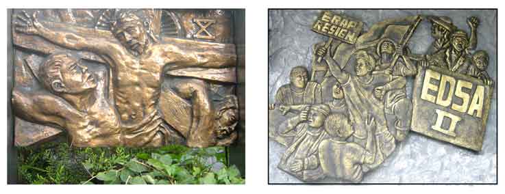 But on this hallowed ground, at the intersection of Ortigas Avenue and Epiphanio de los Santos, they built the EDSA shrine — Our Lady of Peace Quasi-Parish — a small church that holds daily masses, sacramental rituals on designated days, and weekend confessions. Atop they installed a mammoth seven-meter bronze sculpture of the Lady of Edsa. Outside steps will take you up to the courtyard-deck that collars the base of the statue. There's a mural with segments depicting images of EDSA dos. Letters were missing from the quotes screwed onto the wall. Broken terra pots were swept in one corner. The Abueva relief sculptures — an alternative version of the Stations of the Cross, spaced around the courtyard — is reason enough for an up-close visit to the shrine. Alas, there were no lingering or meditating spaces. It seemed uninviting, designed to hurry you out. With no place for cover, threatening dark clouds and an imminent downpour rushed me out of of the shrine, down the steps, into a sidewalk crowded by lines of people waiting for public transportation.