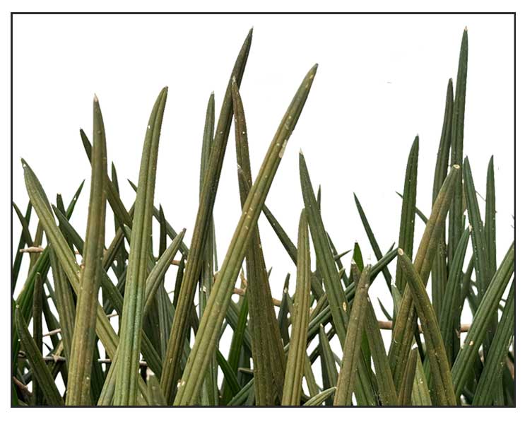 • Espada is a cylindrical, succulent perennial herb. Leaves are are green, swordlike, cylindrical and rigid, furrowed or grooved along its entire length, with pointed tips, sometimes with a dark green striped pattern, growing to a height of 2 feet or more, up to about 3 centimeters thick. Flowers are very small, white, fragrant, and crowded in