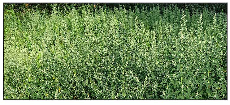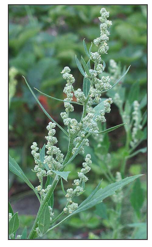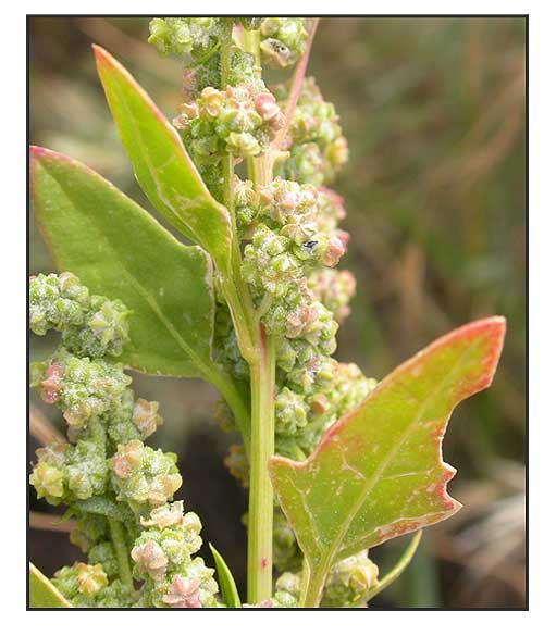 • It tends to grow upright at first, reaching heights of 10–150 centimeters (4–59 in), rarely to 3 m); it then typically becomes recumbent after flowering (due to the weight of the foliage and seeds) unless supported by other plants. Leaves are alternate and varied in appearance. The first leaves, near the base of the plant, are toothed and roughly diamond-shaped, 3–7 cm long and 3–6 cm broad. The leaves on the upper part of the flowering stems are entire and lanceolate-rhomboid, 1–5 cm long and 0.4–2 cm broad; they are waxy-coated, unwettable and mealy in appearance, with a whitish coat on the underside. Small flowers are radially symmetrical and grow in small cymes on a dense branched inflorescences 10–40 cm long. Flowers are bisexual and female, with five tepals which are mealy on outer surface, and shortly united at the base, with five stamens. (1)