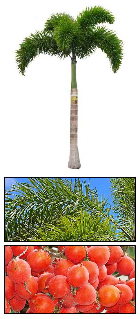 Wodyetia bifurcata is a recent introduction to the world of palms—a fast growing, large-sized evergreen tree, growing up to 10 meters tall. Pale green arching fronds have leaflets radiating out at all angles from the stems. A mature palm has a canopy of 8 to 10 leaves, each with the characteristic foxtail or bottle-brush appearance, with a crown of foliate 4.6 to 6.1 meters across. Trunk is slender, closely ringed bottle shaped to columnar, growing to a height of 9.1 meters. Fruits occur in colorful clusters of red to orange-red, each containing one seed, brown-black in color, up to 3-4 centimeters. (1)