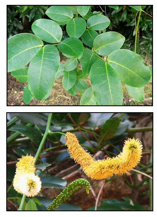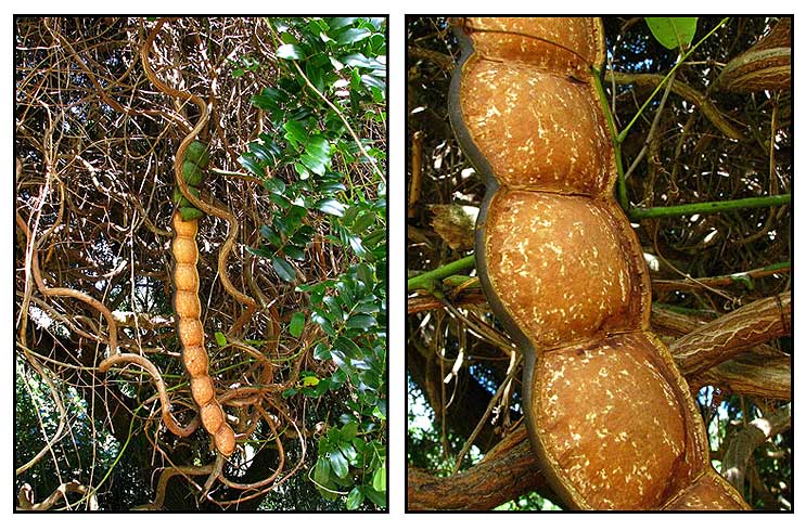 • Evergreen, ligneous, large lianas; stems twisted. Leaves bipinnate, 10-25 cm long, usually with 2 pairs of pinnae, rachis often ending in a tendril; pinnae with 2-4pairs of leaflets and terminal tendrils; leaflets opposite, oblong or long obovate, 3-9cm long, 1.5-4cm wide, apex obtuse or emarginated, base slightly oblique. Spikes 15-25cm long, single or paniculate, flowers white, dense; calyx late-campanulate, 2mm long, 5-toothed; petals 5, oblong, 4mm long, slightly connate at base; stamens 10, free; slightly exserted; ovary glabrous. Pods toward 1m long, 8-12cm wide, compressed, septate, with thick sutures; seeds suborbiculate, 4-6cm in diam.