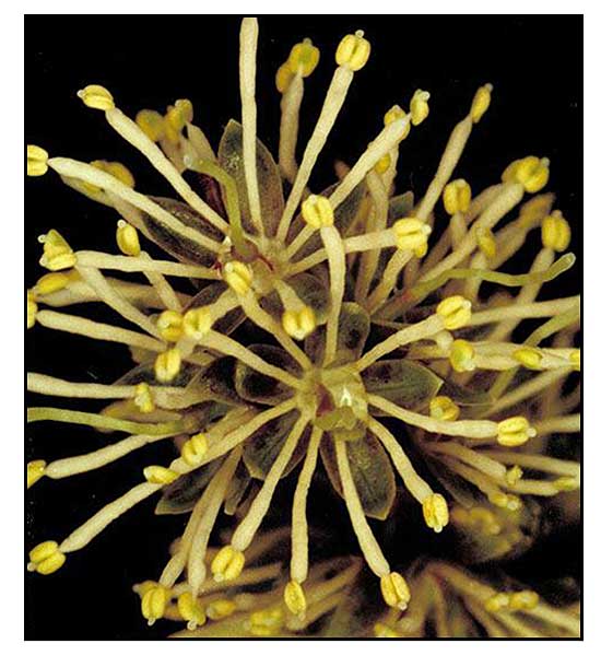 are oblong or obovate, 2.5 to 5 centimeters long, rigidly leathery and smooth. Flowers are 2 to 3 millimeters long, yellowish white, either crowded