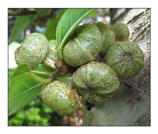 Ficus septica is a tree or shrub up to 25 m. Latex is characteristically yellow. Leaves and petioles are both glabrous. Leaves are symmetric, elliptic to oblong. Figs often grow in pairs but can be solitary or in groups of up to four, with 7 to 12 ribs towards the ostiole. At maturity, whitish to yellowish dots appear on the fig. Those in the Philippines have stems covered by short hairs while those in Taiwan are glabrous. (27)