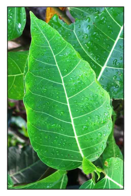 Note: The water drops on the Ficus septica leaf (above/right) are not the result of rain or morning dew but expelled by "gutation", a natural process in plants that involves pushing out or secreting excess liquid from the leaves or blades. It occurs only at night while the stomata or small pores on the surface of the leaf are closed. It is common in many species of figs including F. elastica and F. chartacea. (Figs of Borneo) (32)