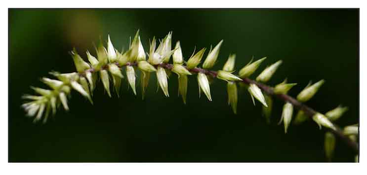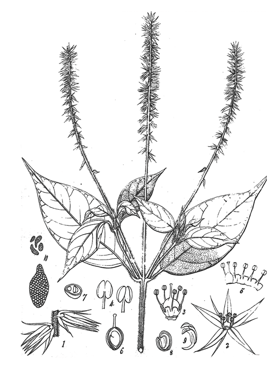 • Achyranthes bidentata is a perennial herb, 40-170 cm tall, stem quadrangular, furrowed, rather flaccid, thinly to densely pubescent, often purple in upper part. Leaves elliptical-oblong, lanceolate or ovate, 5-20 cm × 2-8 cm, base attenuate, apex mostly long acuminate, sparsely to densely velvety tomentose on both sides, petiole 0.5-3.5 cm long. Spike terminal and axillary in the upper leaf axils, 4-45 cm long, including 1-15 cm long peduncle, more or less whitish-tomentose, bract ovate-oblong, 3-3.5 mm long, apex acuminate, not pungent, margin ciliate, bracteoles spinescent, as long as perianth, 3.5-5.5 mm long, apex often recurved, basal wing inserted on lower part of spine. Tepals membranaceous, veins absent, acute, 4.5-7 mm long, not pungent in fruit, pseudo-staminodes truncate, dentate. Utricle oblong, 2-2.5 mm long. (1)