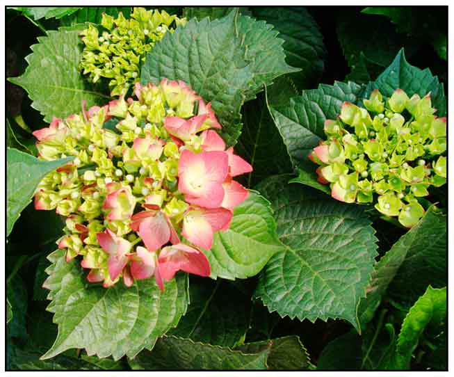 Hydrangea is a deciduous shrub growing to a height of 1.5 to 2 meters. Leaves are opposite, petioled, oblong-ovate, acuminate, light green with serrate margins, up to 15 cm long. Flowers are in large, terminal cymes; clusters up to 12 centimeters across, blue, pink, or white, with broadly oval sepals. Fruit is a subglobose capsule.
