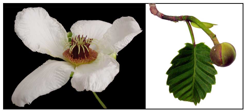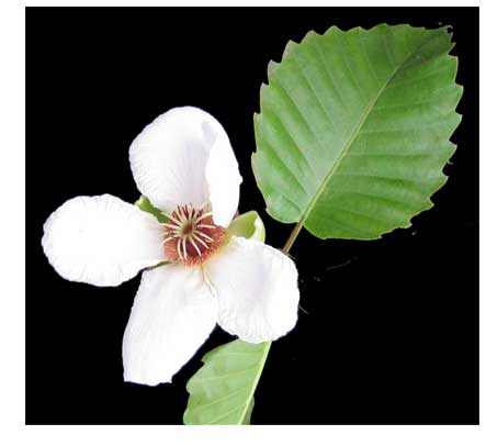Indian Catmon is a more or less deciduous tree growing up to 10 meters or more in height, with a few wide-spreading branches. Leaves are alternate, mostly terminal, oblong or broadly lanceolate, 20 to 30 centimeters long, 6 to 12 centimeters wide, stiff, curving outward, with toothed margins, and beautifully ribbed, with 30 to 40 pairs of side veins. Flowers are very large, 15 to 20 centimeters across, solitary at the ends of the twigs, are facing downward. Sepals are rounded and yellowish green, while the petals are white, free, obovate, and 5 to 7.5 centimeters wide. Fruit, which is made of ripened carpels and enclosed by greatly enlarged and thickened imbricating sepals, is large, somewhat rounded or broadly ovoid, 12.5 to 15 centimeters in diameter, yellowish green hard, and tough. Seeds are numerous and compressed, with a hairy margin.
