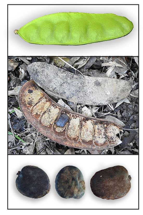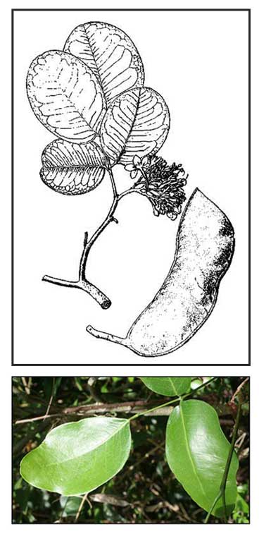 6 to 10 centimeters long. Pods are oblong or pear-shaped, woody, tardily dehiscent, 10 to 25 centimeters long and 4 to 6 centimeters wide, with