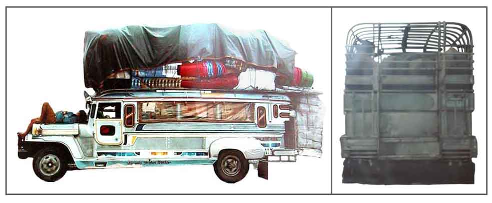 As much as you can fit in it, strap on it and tie on it. It . Before the coming of the Elf, it was the workhorse of most small to medium sized hauling and transporting needs. (Left) Note the driver taking a nap on the hood. (Right) Yes, backsides of 4 carabaos (water buffalos).