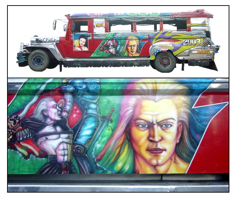 | This heavy-metal fantasy artwork on a stainless steel shell is a head-turner. The airbrush technique achieves details and shades not available through the sticker artform. Replete with front, rear and side rubber splash guards and mud flaps. Also, the usual driver-side spare tire is absent, located instead is on the rear-underside. Note the roof-edge lettering: "Gift of God." |