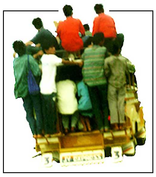 It's not just how many can fit in, but how many inside-and-out. Illegal and an unlikely sighting in the urban-suburban areas, this is common in the provincial jeepney routes, especially in the morning and late-afternoon "rush hours." Above was a sighting in the Cagayan Valley area. . . And up there, alfresco on the roof top, enjoying the scenic bucolic vistas, zigging and zagging up and down mountain roads, with not much to hold on to . . . uhhmm . . . that might qualify as some "essential part of your Philippine adventure." |