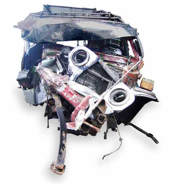 With no stringent regulations on safety and licensing, backyard production is not uncommon. A license for automotive repair covers for unlicensed build-one-sell-one jeepney production. With a small investment of welding machines, rivets and drills, acetylene cutters, buffers, and grinders and piecemealing out of work for bending, hoodworks, fenders, center-grilles and sticker-art. A four- to six-week effort can come up with a rectangular hunk of metal-on-wheels, with engine and chassis reincarnate from heaps of Japanese surplus and a motley of scavenged and salvaged worn-out and rusting substandard junkyard parts. To an exterior of galvanized and gleaming stainless steel, borloloy it up with accessories as much as deep pockets can shell out and. . Voila! A rolling symbol of the Filipino's ingenuity, innovativeness and creativity. Some back-yard production jeepneys are done really on-the-cheap, requiring frequent make-do repairs and maintenance. It is sorely lacking in safety features, poorly maneuverable. The underbelly may be severely wanting of anti-collision reinforcements. It is not uncommon to see one weaving in-and-out of lanes, aggressively overtaking on thread-poor Kojak-tires. . . Alas, a deathtrap-on-wheels. |
