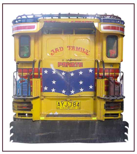 An unusual jeepney backside – Usually a doorless entrance wih generic grillwork, this rear end is fashioned with double back doors, red-white-and-blue stars-and-stripes design. The shark-fin guards are popular in the Baguio area.