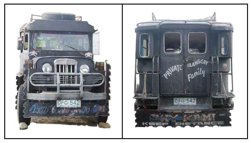 Black & Bare You won't see too many monotoned jeepney, this one, black to boot. And, almost barren hood. Note—the roof-stored spare tire, the shark-fin rubber flap design suggesting Benguet roots. Indeed, spotted in Marcos Highway, seemingly long-term parked, languishing in road-side retirement. The back rubber guard says: