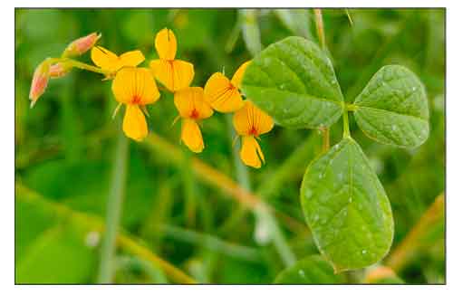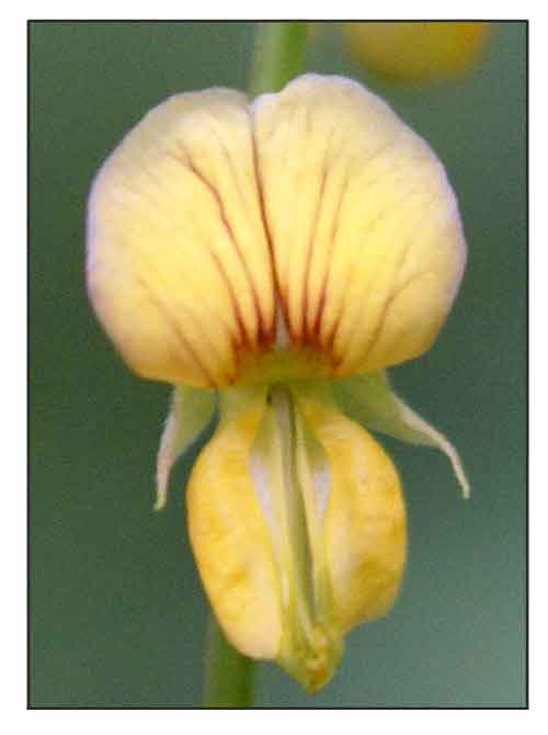 • A perennial herb with twining or trailing stems which can reach 1.2 meters in length. Leaves are made up of three leaflets measuring up to 3- to 3.5 centimeters long. Inflorescence is a raceme of up to 15 flowers. Flowers are yellow with purple or brown veining and measure up to 8 millimeters long. Fruit is one or two centimeters long. (2)