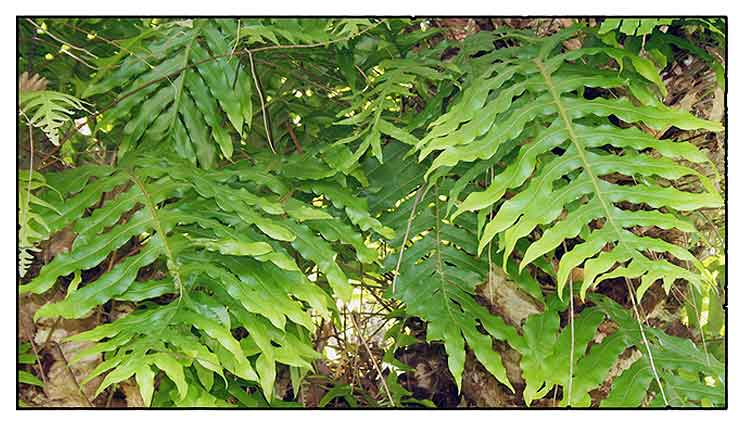 Drynaria sparsisora is an epiphytic, epilithic or terrestrial fern, rhizome 1-3 cm in diameter, fleshy, densely scaly, smooth and snake-like when old, covered with dark scale bases, the narrow apical portions having broken off; scales peltate, appressed, overlapping, narrowed abruptly above the rounded base, tapering to a narrow, acute, rather spreading apex, 1-11 mm × 1-3 mm, stiff, brown to very dark brown, margins paler and bearing very fine hair-like teeth. Base leaves imbricate, ovate, 10-35 cm × 10-25 cm, margin shallowly or deeply lobed, the lobes rounded; foliage leaves stiffly erect; petiole 5-18 cm long, winged; lamina leathery, deeply pinnatifid, in outline 30-80 cm × 15-30 cm, the lobes strap-like, narrowed slightly towards the base, tapering to a mostly acute apex, 10-30 cm × 1.5-4.5 cm; veins reticulate between prominent main lateral veins. Sori round, 1-2 mm in diameter, in more than two irregular rows between adjacent main lateral veins of the foliage leaves, not or only slightly sunken into the laminal surface; sporangia glabrous. Spores with spines. (1)