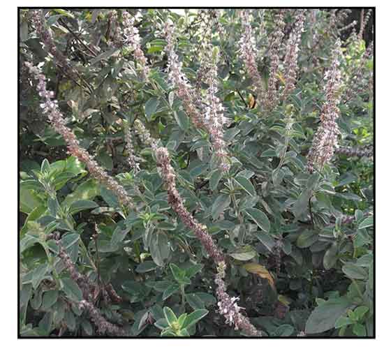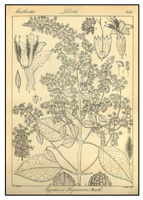 • P. heyneanus is a large aromatic herb, straggling under shrub with horizontal branches, and the stem ascends to 1.72 m higher. Leaves are 4-angled, lanceolate and 5-12.5 cm long; simple, opposite, without stipules and slightly hairy on both sides. Petioles are 2.5-7.5 cm long. Flowers are irregular, bisexual, numerous, and sessile in small dense fascicles; white-tinged with pink color in pubescent cylindrical spikes. Calyx is five-toothed. Corolla is normally lilac or white and blipped into 4-lobed. The tube is approximately 5 mm, and the bracts are foliaceous with four stamens. Panicles are 14 cm long and vertically globose and dense. Nutlets are 1 mm in diameter and pale brown. (19)