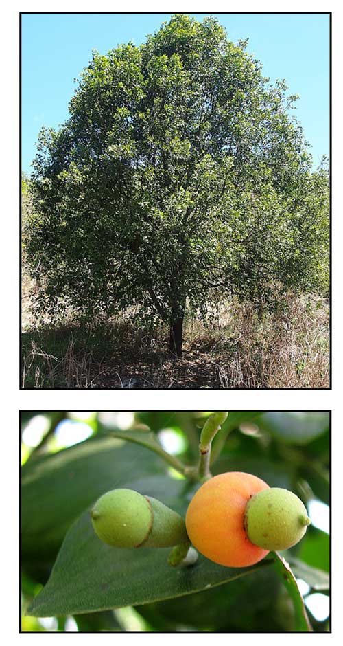 • A small tree (or large shrub) growing to 10 meters tall, hemiparasitic on the roots of other trees. Leaves are approximately as broad as long, around 4 cm long. Flowers are produced in slender spikes mostly approximately 1 cm long. Fruit is a globular nut on a short stalk. As it ripens the stalk swells and turns red, like an inside out cherry. The fruit is 4–6 mm long and is inedible. (4)