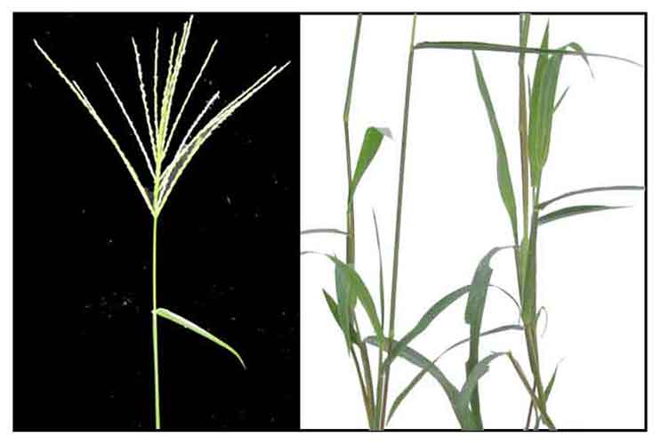 • Growth form: It is an erect, annual grass, up to 50 - 90 cm tall. Foliage: Leaves are smooth and linear, reaching 10 - 20 cm long and 1 - 6 mm wide. The leaf sheaths are flatten and membraneous with a minute ligule (projection at the top of the leaf sheath). The leaves are arranged distichously (alternately in two ranks) along the culms. Stems:The culms (above-ground stems of grasses and grass-like monocots) are erect, up to 50 - 90 cm. The culms are occasionally decumbent (lying on the ground, but with the distal end upright), rooting at the nodes. Flowers: Inflorescence is a panicle of 7-17 spikes, each 4 - 7.5 cm long and 3 - 4 mm wide, with spikelets arranged in two rows. Each spikelets are tinged with purple and made of 3 - 4 florets, consisting of heavily reduced petals and sepals, anthers, and stigmas. The first lemma (the outermost of two bracts enclosing a grass floret) has a subapical tuft of long hairs. Fruit: Fruit is a caryopsis (a type of dry, indehiscent fruit, commonly known as a grain).