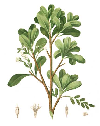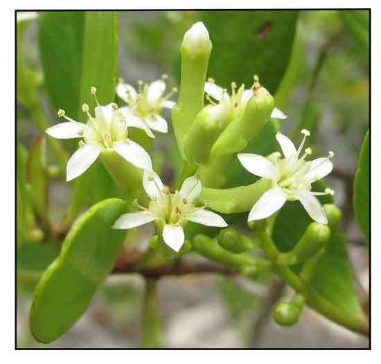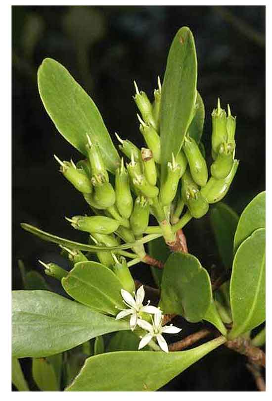 • Kulasi is a tree reaching a height of 18 meters, flowering when 1 meter high or less. Air-roots are few in number. Leaves are fleshy, green, shining, narrowly obovate, 2.5 to 7 centimeters long, with rounded and notched tip and pointed base. Flowers are bright scarlet, about 8 millimeters long. Calyx is oblong-cylindric, green, 5 to 6 millimeters long, and short-toothed. Petals are white, oblong, about 4 millimeters long. Stamens are 10, as long as the petals. Fruit is green, woody, oblong, 1.5 to 2 centimeters long, and crowned by persistent calyx-rim, containing a single seed.